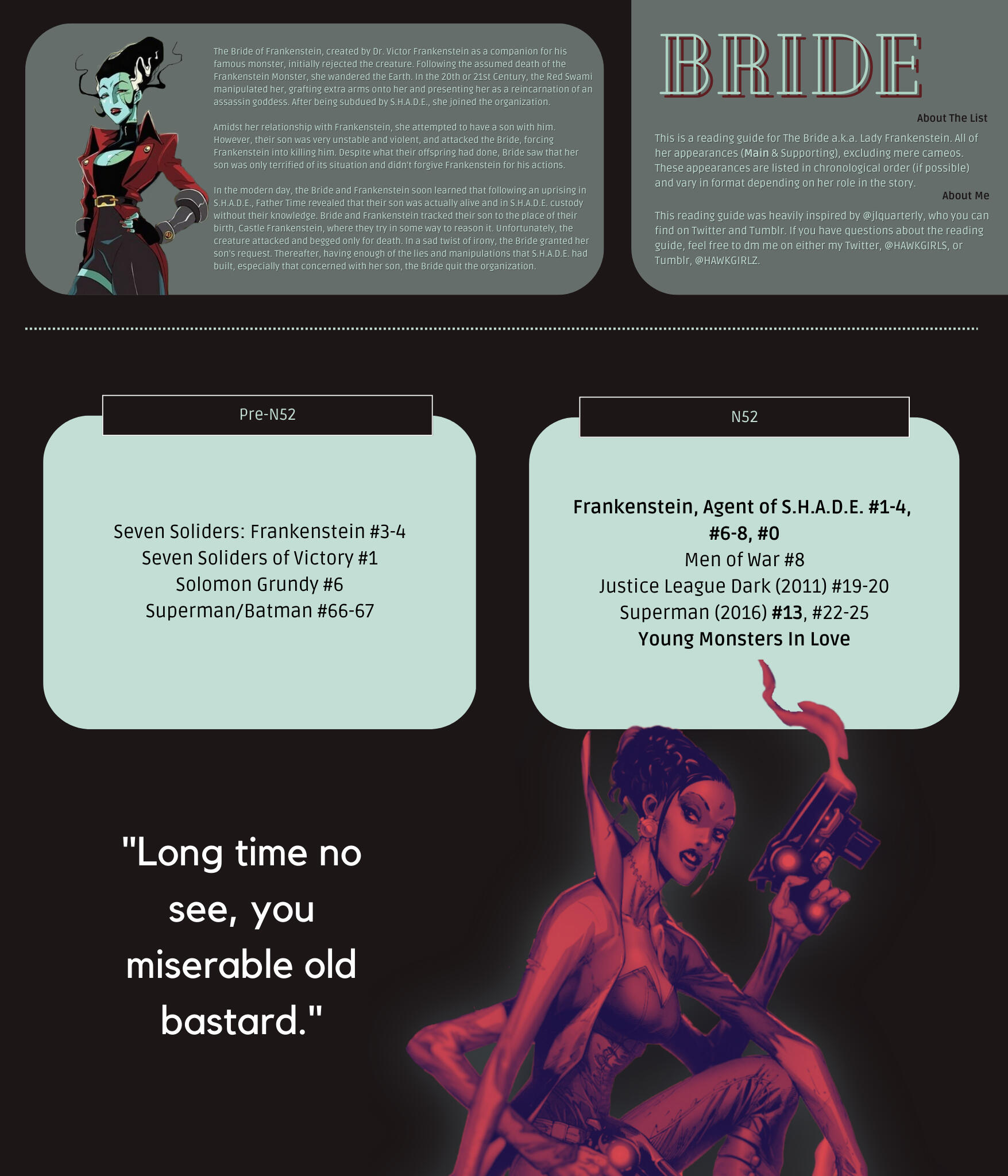 media: dc (mainly hawks/jsa now), animanga, tv, films, video games, visual novels, books